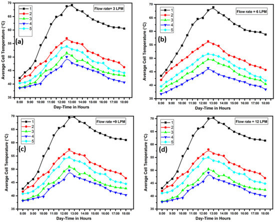 The cell temperature values at a different time of daylight in all cases, such as case 1 and for cases 2, 3, 4, and 5, at different flow rates (i.e., 3 LPM, 6 LPM, 9 LPM, 12 LPM) are recorded and presented in Figure 6. Figure 6a shows the cell temperature (°C) for case 1 and cases 2, 3, 4, and 5 (at 3 LPM), and its maximum cell temperature was recorded as 69.2, 56.9, 51.5, 50.0, and 53.9 °C, respectively, at midday. Similarly, Figure 6b–d shows the PV temperature for case 1 and cases 2, 3, 4, and 5 at a flow rate of 6, 9, and 12 LPM. The maximum PV cell temperature (°C) was recorded for case 1 and cases 2, 3, 4, and 5 as 69.7, 57.5, 51.1, 49.5, and 54.5 °C (at a flow rate of 6 LPM), 70.4, 58.0, 50.5, 49.0, and 55.0 °C (at a flow rate of 9 LPM), and 68.9, 56.3, 49.6, 46.4, and 51.6 °C (at a flow rate of 12 LPM), respectively, at midday. An increase in the nanoparticle concentration by up to 0.15% has improved the decline in PV temperature. However, a further increase in the weight fraction of nanoparticles reduces the stability of nano-fluids due to the high chance of agglomeration of nanoparticles. The maximum PV surface temperature drop of 22.5 °C is recorded at a 12 LPM flow rate, while temperature drops of 21.3 °C, 20.3 °C, and 19.2 °C are obtained at 9, 6, and 3 LPM, respectively, for a 0.15% concentration of MgO nanoparticles. A reduced PV surface temperature with an increased flow rate is due to the movement of a large amount of working fluid across the Cu-tube in a shorter time, which extracts more thermal energy from the PVT system and causes a fall in PV cell temperature.
