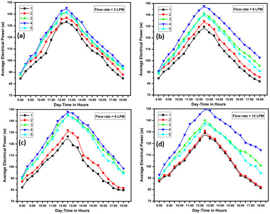 Figure 7 illustrates the variations in recorded PV power output at different times of the day for the analyzed cases at different flow rates (i.e., 3 LPM, 6 LPM, 9 LPM, 12 LPM). Figure 7a shows the recorded maximum electrical power at midday for case 1 and cases 2, 3, 4, and 5 at a flow rate of 3 LPM as 133.42, 136.89, 141.59, 145.32, and 141.92 W, respectively. Similarly, Figure 7b–d shows the highest electrical power for case 1 and cases 2, 3, 4, and 5 at a flow rate of 6 LPM, 9 LPM, and 12 LPM. The maximum PV power output at midday is recorded for case 1 and cases 2, 3, 4, and 5 as 129.69, 134.49, 141.45, 147.78, and 140.32 W for 6 LPM; 126.53, 131.49, 141.45, 147.78, and 140.32 W for 9 LPM; 129.13, 130.95, 140.11, 150.04, and 137.17 W at 12 LPM, respectively.
