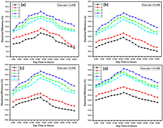 Figure 8b–d shows the maximum electrical efficiency at midday for cases 1 and 2, 3, 4, and 5 at 6 LPM, 9 LPM, and 12 LPM. The maximum electrical efficiency (%) at midday for case 1 and cases 2, 3, 4, and 5 was recorded as 11.92%, 12.34%, 13.98%, 14.36%, and 14.16% at 6 LPM; 12.25%, 12.65%, 14.53%, 14.85%, and 14.15% at 9 LPM; and 12.76%, 13.31%, 14.80%, 15.15%, and 14.15% at 12 LPM, respectively.