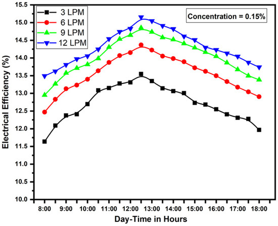 Figure 9 represents the variation in electrical efficiency for case 4 (0.15 wt.% of MgO) at different flow rates (3, 6, 9, 12 LPM) and different times of the day. The maximum electrical efficiency in case 4 (0.15 wt.% of MgO) at 3 LPM, 6 LPM, 9 LPM, and 12 LPM was recorded as 13.54%, 14.36%, 14.85%, and 15.15%, respectively, at the highest solar radiation. It has been detected from Figure 9 that the electrical efficiency improves by enhancing the flow rate of the flowing fluid. The maximum PVT system electrical efficiency was obtained at 12 LPM MgO nano-fluid flow rate followed by 9 LPM, 6 LPM, and 3 LPM. The maximum PVT system electrical efficiency was obtained as 15.15% for case 4 of this study.