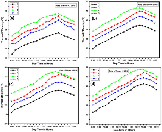 Figure 10 represents the variation in thermal efficiency (%) for cases 2, 3, 4, and 5 of the PVT system at different flow rates (i.e., 3, 6, 9, 12 LPM) and daytime. Figure 10a illustrates the thermal efficiency PVT system for cases 2, 3, 4, and 5 at a flow rate of 3 LPM, and the maximum thermal efficiency was obtained as 33.40%, 42.46%, 43.59%, and 40.33%, respectively, during the period from 14:30 HRS to 16:30 HRS of daytime. Figure 10b–d illustrates the thermal efficiency PVT system for cases 2, 3, 4, and 5 at 6 LPM, 9 LPM, and 12 LPM flow rates. The maximum thermal efficiency PVT system was recorded as 37.35%, 44.86%, 46.57%, and 42.16% for 6 LPM; 37.82%, 46.04%, 47.75%, and 42.16% for 9 LPM; and 41.26%, 47.27%, 48.83%, and 44.51% for 12 LPM, respectively, for cases 2, 3, 4, and 5, during the period from 14:30 HRS to 16:30 HRS of daytime. The thermal efficiency of PVT systems is improved by enhancing the working fluid flow rate because the heat transport capacity increases at higher flow rates and optimum MgO concentration. The highest thermal efficiency was recorded in case 4 (at 0.15% MgO) for all the PVT systems. The optimum MgO concentration for maximum thermal efficiency was found to be 0.15%, and at this concentration, the thermal efficiency of case 4 was improved by 48.83% at a flow rate of 12 LPM compared to case 1.