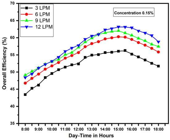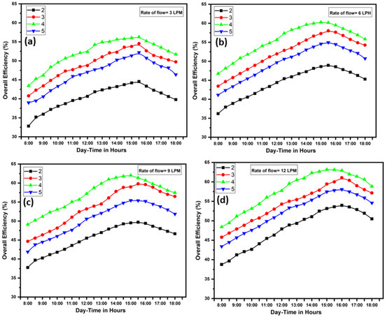 Figure 11 represents the variation of overall efficiency at different flow rates (i.e., 3 LPM, 6 LPM, 9 LPM, 12 LPM) for cases 2, 3, 4, and 5 at different daytimes. Figure 11a represents the overall efficiency for cases 2, 3, 4, and 5 at 3 LPM, and the maximum overall efficiency was obtained as 44.55%, 54.56%, 56.28%, and 52.21%, respectively, between 14:30 HRS and 16:30 HRS of daytime. Figure 11b–d represents the overall efficiency at flow rates of 6 LPM, 9 LPM, and 12 LPM for cases 2, 3, 4, and 5. The maximum overall efficiency (%) was obtained as 48.95%, 58.02%, 60.30%, and 54.96% for 6 LPM; 49.69%, 59.80%, 62.04%, and 55.43% for 9 LPM; 53.97%, 61.08%, 63.16%, and 58.07% for 12 LPM, respectively, between 14:30 HRS and 16:30 HRS of daytime for cases 2, 3, 4, and 5. The overall efficiency of PVT is maximum at a concentration of 0.15% (case 4) and for all flow rates (i.e., 3, 6, 9, and 12 LPM) at different daytime. Figure 12 represents the variation in overall efficiency at different flow rates (i.e., 3, 6, 9, and 12 LPM) at a concentration of 0.15% of MgO (case 4) at different daytime. The maximum overall efficiencies (%) at 3 LPM, 6 LPM, 9 LPM, and 12 LPM were recorded as 56.28%, 60.30%, 62.04%, and 63.16%, respectively, between 14:30 HRS and 16:30 HRS of daytime. The overall efficiency of MgO nano-fluid at concentrations of 0.15% and flow rates 3 LPM, 6 LPM, 9 LPM, and 12 LPM compared to water is enhanced by 11.73%, 11.35%, 12.35%, and 9.19%, respectively.