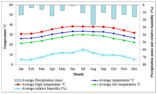 Average temperatures, precipitation, and relative humidity in the study area (Station Jizan, 2021).