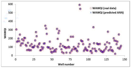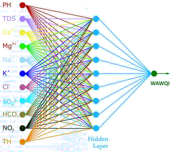 The input parameters of the ANN model in this work were 11 input neurons, which included physicochemical parameters such as pH, TDS, Ca2+, Mg2+, Na+, K+, Cl−, SO42−, HCO3−, NO3−, and TH, while the output neurons were the WAWQI (Figure 3). In the hidden layer, nine neurons were used. Moreover, 75% of the dataset was allocated for training the models, and the remaining were considered for testing and validating the models.