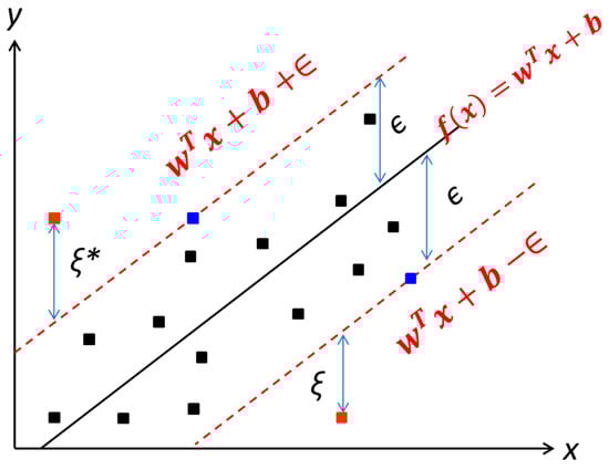where the parameters w and b are the gradient and the intercept, respectively, and ε represents the tolerance margin, as shown in Figure 4.
