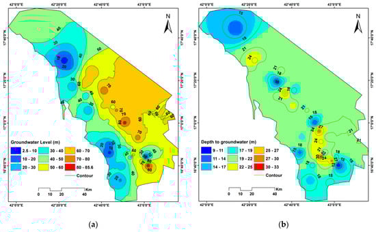 (a) Groundwater level (m.asl), (b) depth to groundwater in the study area.