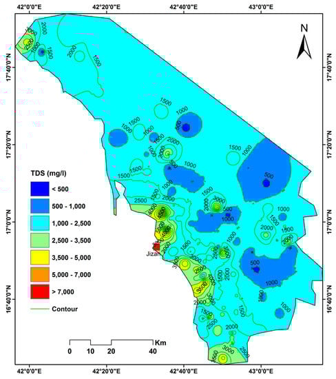 The results of the chemical analysis indicated that the dominant cations are Na+, followed by Ca2+ and Mg2+, while the dominant anions are Cl− followed by SO42− and HCO3−, with a minor contribution of NO3−. Cations and anions reflect sodium chloride water type (Table 1). The pH of the groundwater ranges between 6.33 and 8.68, with an average of 7.66 indicating more or less neutral groundwater that is generally suitable for drinking. TDS is an important parameter for assessing salinity hazards and suitability for drinking and irrigation. The TDS ranges from 128 mg/L in the boreholes located further inland to 8320 mg/L close to the coastline, with an average of 1709 mg/L; thus, a wide range of variation was detected (Figure 6). The higher TDS values are recorded in groundwater wells near the Red Sea coast, indicating significant groundwater salinisation due to seawater intrusion. This seawater intrusion in the coastal aquifer of Jazan was confirmed by Abdalla [], Abdalla et al. [], Al-Bassam and Hussein [].