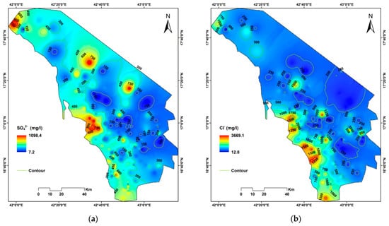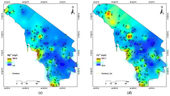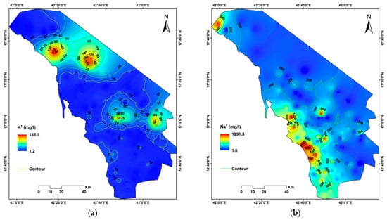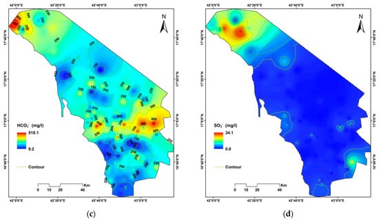 The spatial distribution of the major cations (K+, Na+, Mg2+, Ca2+) and major anions (SO42–, Cl−, HCO3−, NO3−) is shown in Figure 7 and Figure 8, respectively.