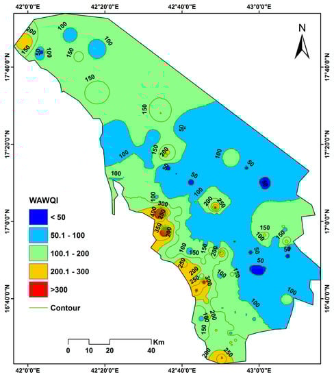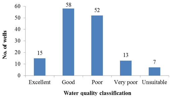 The calculated WAWQI shows that 15 wells have a score of less than 50, indicating excellent water quality, according to Kumar et al. [] (Table 3). The WAWQI of 58 wells ranges from 50.1 to 100, indicating good quality water. Figure 9 depicts the WQI classification: 52 wells have a WQI of 100.1–200, indicating water of poor quality, and 13 wells have a WQI of 200.1–300, indicating water of extremely poor quality. Finally, seven wells have a WQI of greater than 300, indicating that the water is unfit for consumption. The spatial distribution of the WQI over the region is depicted using inverse distance weighted (IDW) interpolation in Figure 10.
