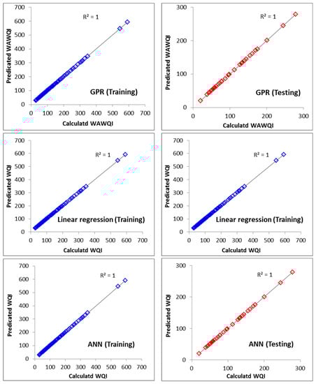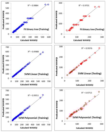 The ME, MAE, RMSE, MAPE, regression factor R, and R2 were used to validate the applied models’ performance (Table 7). The scatterplots of the predicted and calculated WAWQI for the applied models in the training stage (right) and testing stage (left) are shown in Figure 13.