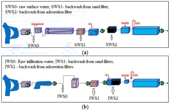 The research was conducted at two water treatment facilities, where the first intake of surface water and the second infiltration occurred. Both treated around 100,000 m3/d of water. Coagulation, sedimentation, sand filtration, ozonation, adsorption (filtered by granulated active carbon (GAC)), and disinfection with pH adjustment techniques are used to treat surface water (SWTP) (Figure 1a). Infiltration water (IWTP) is treated with aeration, sand filtration, ozonation, adsorption (poor filtration by GAC), and disinfection with pH correction (Figure 1b). In both cases, chlorine and chlorine dioxide were used for disinfection.