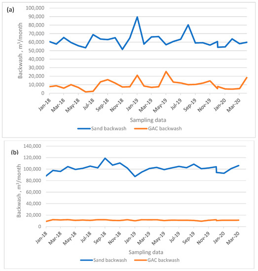 Variable quantity of backwashing from sand and GAC filters (a) SWTP (b) IWTP.