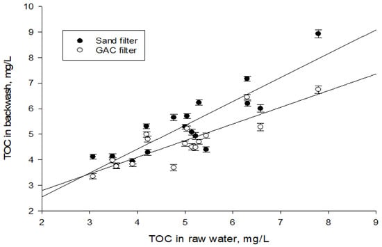 According to an analysis of backwash from the surface of the water treatment plant, the level of organic pollution was similar to the TOC concentration in raw water. The sand backwash system and raw water both had quotient TOC concentrations in the range of 0.81–1.34, which was similar to the GAC backwash system (Figure 3). In conclusion, taking organic pollution into account, both types of backwash systems can be returned to the beginning of the water treatment system without pre-treatment. Other studies of the composition of washings from surface water treatment revealed a significantly higher level of organic contamination, which was probably related to the intake of water with a higher concentration of TOC [19].