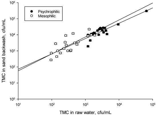 There was a significant amount of suspension in the washings, and their turbidity was even 25 times higher than that of the surface water that had been collected. These results are similar to the other analysis of sand filtration [21]. Except for turbidity, the presence of a large number of microorganisms was found, which was confirmed by studies of the composition of sand filter washings conducted worldwide [3,21,22]. Microorganisms, especially pathogenic or potentially pathogenic bacteria, can have a negative impact on consumers’ health. In the washings from the sand filters, the amount of psychrophilic and mesophilic bacteria was directly proportional to the amount in the intake water (Figure 4). This makes it difficult to return these washings to the water treatment system because the efficiency of their elimination from the washings should be greater in high pollution seasons. The variability of the number of microorganisms in washings depending on the season was also found by Wang et al. [23].