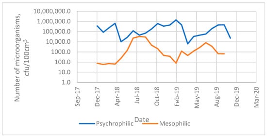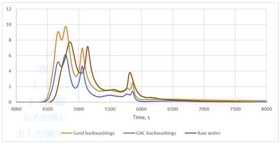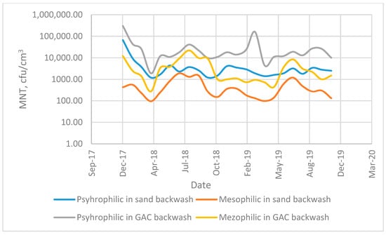 In general, the composition of the sand backwash system correlated with the quality of the raw water; however, a similar correlation was not found in the GAC backwash system. Its composition was dependent on the microorganisms developing phase and the intensity of its flash away [26,27], which demonstrates variation in their number over the exploitation time (Figure 5).