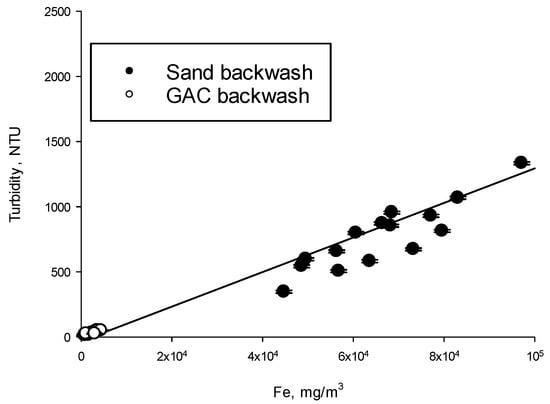 Due to the fact that the presence of sparingly soluble iron compounds determined the turbidity of the backwashings, there was no correlation between turbidity and the quantity of microorganisms. This is confirmed by the correlation found between these parameters in both types of backwashings (Figure 8). The possibility of using sedimentation as a backwashing pre-treatment method to lower the values of both parameters is indicated by the presence of iron compounds in undissolved form.
