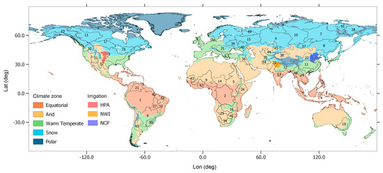 Geographical locations of global river basins used in this study. The names of the basins are listed in Table S1. The Köppen-Geiger climate classification world map is used to characterize the climate zones [21]. The map also depicts heavily irrigated areas, such as the High Plains Aquifer (HPA), Northwest India (NWI), and North China Plain (NCP).
