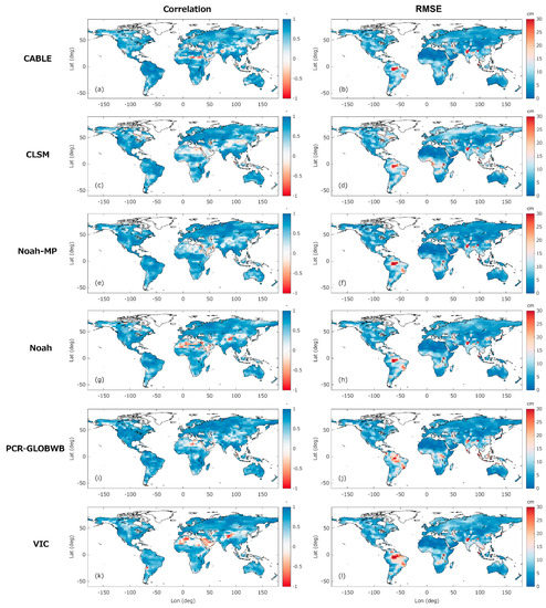 Correlation coefficients (left) and RMSE (right) calculated between model TWS estimates and GRACE JPL masons (CABLE (a,b), CLSM (c,d), Noah-MP (e,f), Noah (g,h), PCR-GLOBWB (i,j), and VIC (k,l)). For ease of interpretation, a different (contrast) color scheme is used for correlation and RMSE, with cool (blue) and warm (red) colors indicating greater and lesser agreement with GRACE data, respectively.