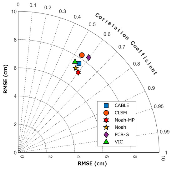 The global average correlation and RMSE exhibit a reasonable agreement between models and GRACE (Figure 3). The average correlation is between 0.5 and 0.6, with Noah-MP outperforming all other evaluated models. The average RMSE is about 6–9 cm, and Noah-MP has the smallest RMSE or best agreement with GRACE. However, it should be noted that Figure 3 only reflects the global average value, while the agreement at the basin level may differ. For instance, CABLE, which is primarily developed by the Australian community, provides the most accurate TWS in Australia (e.g., Murray Darling Basin, see basin 19 in Figure S1), whereas PCR-GLOBWB excels in irrigated areas (e.g., Northeast China, see, e.g., basin 22 in Figure S1).