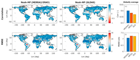 Noah-MP and Noah have similar correlations and RMSEs spatial features in several locations despite Noah-MP superiority. The resemblance is likely due to Noah-MP being built on Noah, and Noah-iMP’s physics representation contributes to improved model performance. The forcing data used in the Noah-MP model simulation also play an important role in improving TWS accuracy. Recall that Noah-MP is forced by MERRA-2 and ERA5 in this study, while Noah is forced by GLDAS forcing data. To demonstrate the impact of forcing data on model performance, the Noah-MP simulation is reperformed with GLDAS forcing data, and the correlation and RMSE are recalculated (Figure 4). Noah-MP associated with GLDAS data exhibits a similar correlation pattern to Noah, e.g., with lower correlation in Central Asia and South America (Figure 2g vs. Figure 4b), confirming the apparent role of forcing data on TWS estimates. Figure 4 also suggests that GLDAS forcing data could be the source of Noah’s negative correlation in Africa and the Tibetan plateau. Despite the use of GLDAS data, Noah-MP still outperforms Noah, which is likely attributable to the enhanced physics representation of the model. The global average correlation and RMSE both point to the same conclusion: Noah-MP (GLDAS) is closer to Noah (Figure 4c,f), and employing MERRA-2 and ERA5 forcing data improves TWS estimates.