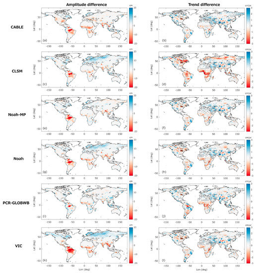 The absolute annual amplitude (left column) and trend (right column) differences calculated between various model TWS results and GRACE data (CABLE (a,b), CLSM (c,d), Noah-MP (e,f), Noah (g,h), PCR-GLOBWB (i,j), and VIC (k,l)). In trend differences (right column), two different marks (cross (x) and dot (·)) are used to indicate the inconsistency in the trend estimates between models and GRACE. Cross (x) represents that model trends are positive, while GRACE shows negative trends. Conversely, dot (·) denotes that models estimate negative trends, whereas GRACE trends are positive. The locations with no marks indicate the agreement between models and GRACE trend directions. The color scheme represents the magnitude difference between models and GRACE, with cool (blue) and warm (red) color tone denoting model estimates that are larger or smaller relative to GRACE data, respectively. For instance, VIC annual amplitude difference (k) depicts a red tone over the Amazon River, indicating that VIC TWS estimates are smaller than GRACE in this area.