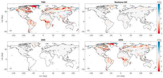 Long-term trend estimates for CLSM TWS components: (a) TWS, (b) rootzone SM, (c) SWE, and (d) GWS.