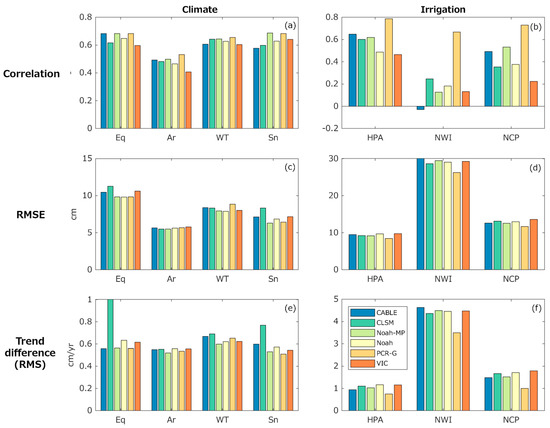 Statistical values, correlation (top row (a,b)), RMSE (middle row (c,d)), and trend difference (in terms of RMS, bottom row (e,f)) calculated between various model TWS estimates and GRACE data averaged across different climate zones (left column (a,c,e)) and irrigated areas (right column (b,d,f)). Climate zones used in this analysis include equatorial (Eq), arid (Ar), warm temperate (WT), and snow (Sn), and irrigation areas include the High Plains Aquifer (HPA), Northwest India (NWI), and North China Plain (NCP). Higher correlation, lower RMSE, and lower trend difference (RMS) values indicate a stronger agreement between the model and GRACE.