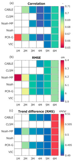 Various combinations of six ensemble members (obtained from six model TWSs) are investigated here. GRACE is used to evaluate the ensemble mean TWS in terms of correlation, RMSE, and trend difference (as RMS, see explanation in Section 3.3), and the global average values are analyzed for each combination. Figure 8 depicts the optimal statistical value from different combinations (e.g., using two (2M), three (3M), and four ensemble members (4M)) where models with color are used in that combination. For example, when only one model is used (1M), PCR-GLOBWB provides the highest correlation value, 0.66 (Figure 8a). When two models are used (2M), the ensemble mean of CABLE and PCR-GLOBWB yields the best correlation value, 0.69. The correlation values increase with the number of models and reach the highest value (0.71) when four models are used: CABLE, CLSM, Noah-MP, and PCR-GLOBWB. The values decrease when the VIC or Noah model is included in the calculation. The inclusion of PCR-GLOBWB in the ensemble mean calculation is necessary to achieve the best correlation estimate.