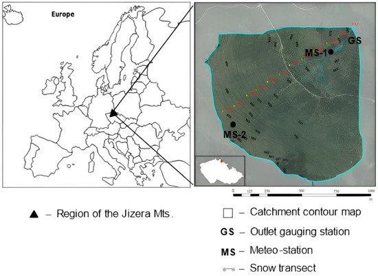 The experimental catchment (Figure 1) was instrumented in 1982. At the catchment outlet, runoff is registered by the sharp-crested V-notch weir hydraulics [36]: the water level and temperature are registered in ten minutes intervals by the automatic recorder ALA 4020 (ALA, Bučovice, Czech Republic). Meteorological observations are carried out along the vertical transect harvested in 1984 (Figure 1): precipitation, air temperature and humidity, global radiation, and soil moisture are observed in hourly intervals by the ALA system (Bučovice, Czech Republic) at 975 m asl. Additionally, three modified Hellmann rain gauges (area of 200 cm2, plastic collectors) are installed at elevations of 862, 899, and 975 m.