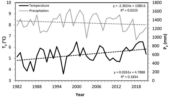 Trends in mean annual temperature Ta and annual precipitation Pa (1982–2021).
