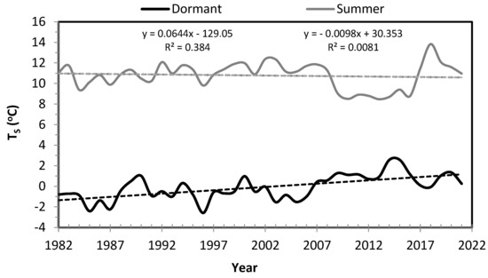 Trends in mean seasonal temperature Ts for winter (dormant months XI–IV) and summer (V–X) months.