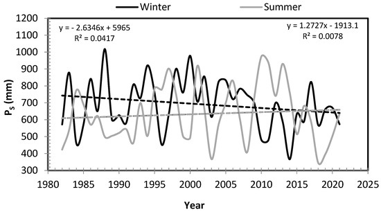 Trends in seasonal precipitation Ps for winter (XI–IV) and summer (V–X) periods.