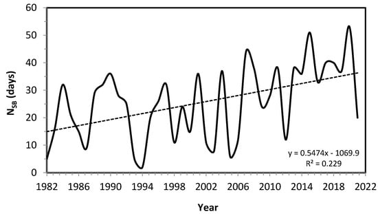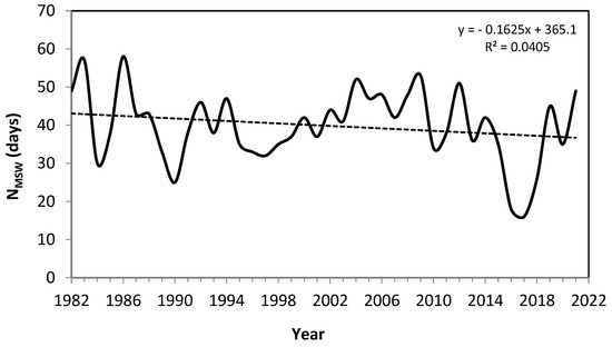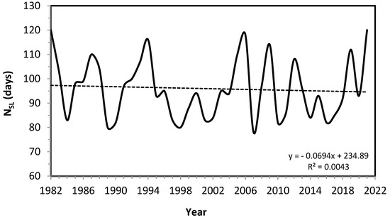 The length of the snow season is becoming shorter (Figure 5 and Figure 6). During the period 1982–2021, the first snowpack date was delayed by 5.5 ± 1.2 days per decade (p = 0.0001, R = 0.48), but the last snow cover date does not shift significantly (p = 0.12, R = 0.07). This recent shortening of snow seasons by 5.5 days per decade exceeds the figure of 3.4 days per decade reported by [47] for North America since 1972 and corresponds with the largest decreases in snow cover duration in zones of seasonal mean air temperatures ranging from −5° to +5°C, as reported by [24]. The decreasing trend in the onset of snowmelt season (considered by snowpack depletion after reaching the maximum snow water equivalent) (Figure 7) is not significant at the 0.05 threshold (p = 0.26, R = 0.20).