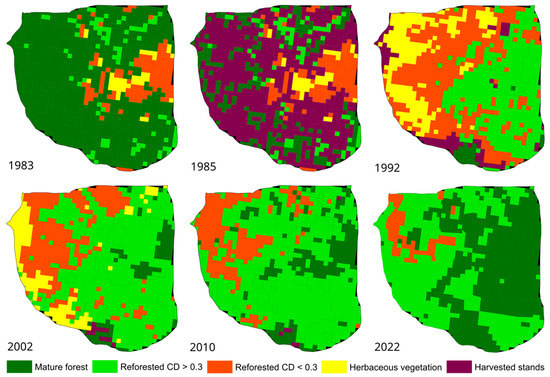 The vegetation canopy in the investigated catchment was analysed by satellite data supported by ground observations [41]. Basic forest parameters (tree species, age, basal area, tree height, timber volume, and horizontal canopy density) were evaluated by standard techniques [42]. The LANDSAT imagery (with a resolution of 30 m) was used to identify the vegetative cover in years 1983 (mature spruce stands), 1985 (extensive clear-cut), and consecutive years of 1992, 2002, 2010, and 2022 to detect the progress in reforestation. Only the clear-sky images of the summer seasons (June–August) were considered. From the multi-band raster images, five canopy classes were identified: (1) mature spruce forests, (2) stands of a crown closure above 0.3, (3) plots with a crown closure below 0.3, (4) areas covered only by grass communities, and (5) clear-cut areas. These classes correspond with the forest classification used by the United Nations Framework Convention on Climate Change [43].