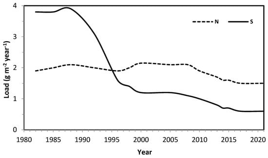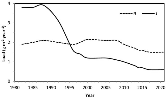 Annual values of the open field load of sulphur and nitrogen registered at Jizerka in the years 1982–2021 are presented in Figure 9.