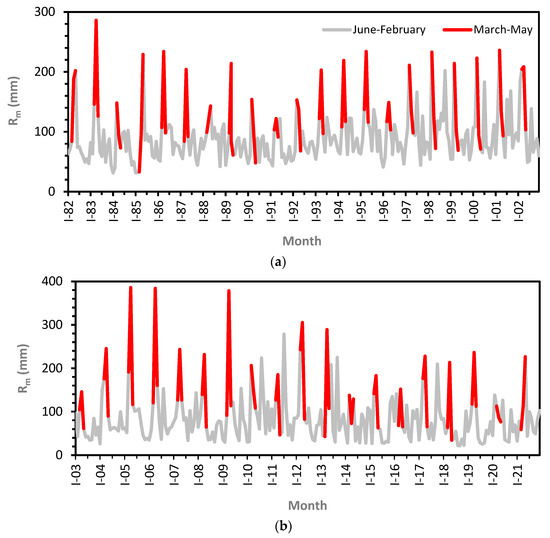 (a) Monthly runoff Rm (mm), 1982–2002. (b) Monthly runoff Rm (mm), 2003–2021.