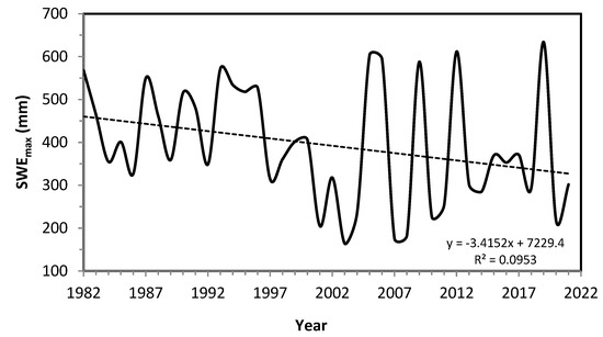 Annual maxima of snow water equivalent SWEmax (mm), 1982–2021.
