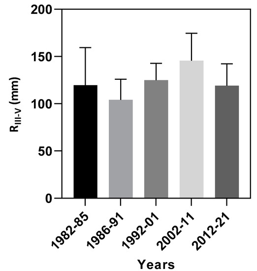 Medians (with 95% confidence) of snowmelt runoff RIII-V (March–May) for years spans: 1982–1985, 1986–1991, 1992–2001, 2002–2011, and 2012–2021.