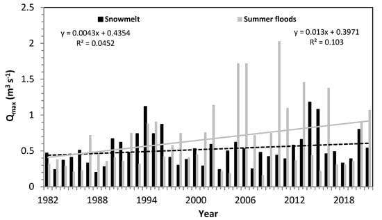 The frequency of observed peak flows between 1982 and 2021 was estimated by extrapolating the annual maximum series (skewness 2.74 and variation coefficient 0.41) with the Log–Pearson III Distribution [36]. In the investigated 40 years, snowmelt processes dominated the annual peak flows in 18 years (i.e., 45%, mainly in March–April) and summer flash floods in 22 years (i.e., 55%, mainly in July–August), Table 3.