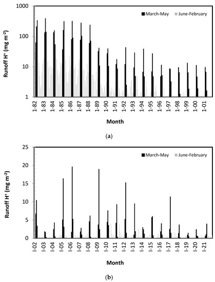 (a) Monthly runoff H+ (mg m−2), 1982–2001. (b) Monthly runoff H+ (mg m−2), 2002–2021.