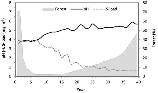 Seasonal stream water pH (March–May), annual open field load of sulphur (S-load, mg m−2), and areal percentage of forest stands (with canopy density CD > 0.3) in 40 years of observation (1982–2021).