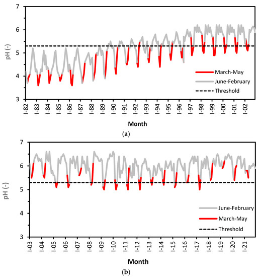 With respect to the drinking water standard, pH is one of the most important operational water quality parameters [54]. Without acid rain, distant headwater streams would have a pH level near 6.5 [55]. The drop in pH, particularly in the springtime (Figure 20), is associated with increased mobility of aluminium and heavy metals in the podzolic soil layer with a negative impact on water biota [56]. A threshold of pH = 5.3 is associated with the rapid mobilisation of toxic aluminium [57]. Particularly, low pH, low hardness (up to 10 mg L−1 of calcium and magnesium), and high aluminium contents (above 0.2 mg L−1) were observed in surface waters of the Jizera Mountains in the 1980s [22]. In the months March–May, the seasonal drop in pH values is typically below the safe threshold 5.3 (Figure 20a,b).