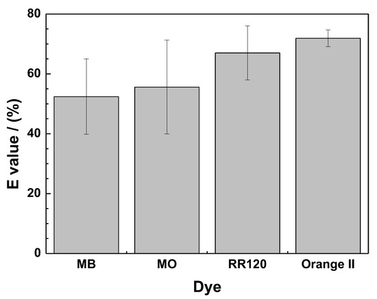 In order to characterize the degree of dye discoloration of the tested systems, the treatment efficiency (E) was calculated (Equation (3)). After the determination of the residual dye concentration (C), the corresponding percentage discoloration (E value) was calculated as follows: