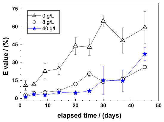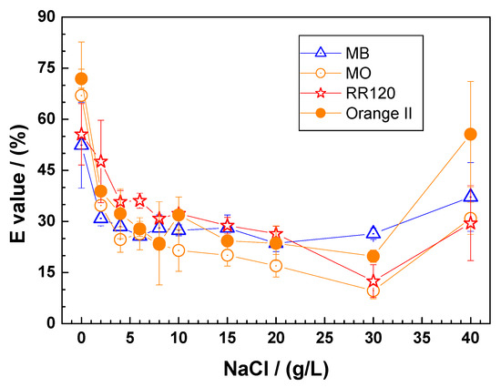 Figure 3 summarizes the extent of dye discoloration after 46 days as the NaCl concentration varied from 0 to 40 g L−1. It can be seen that the presence of Cl− ions inhibits the discoloration of all dyes. The first experimental point at 0 g L−1 NaCl corresponds to the discussion in Section 3.1 (Figure 1), where the dye discoloration decreased in the order: OII > MO > RR120 > MB. A monotonic decrease in E values with increasing NaCl concentration is then observed for [NaCl] < 30 g L−1, alongside a slight increase for [NaCl] = 40 g L−1. This ambivalent situation is similar to that observed in the time-dependent study with MB (Section 3.2) and is related to the relative amounts of Fe(II) and Fe(III) chlorocomplexes and the availability of FeCPs (Equation (2)). Taken together, the results presented in Figure 1 through 3 suggest that it is possible to properly design a Fe0-based remediation system that takes advantage of the enhanced iron corrosion in the presence of Cl− ions. However, this does not mean that Cl− ions generally increase the efficiency of Fe0/H2O systems. Similar results have been obtained with hybrid Fe0/aggregate systems, including Fe0/MnO2 [43,44,45,77,81], Fe0/pumice [18,82], and Fe0/sand [30,52,79,83]. In other words, designing a sustainable Fe0 remediation system in a saline environment requires a careful consideration of the balance between acceptable Cl− concentration and contaminant removal efficiency for each Fe0 material.