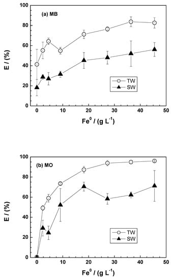 Figure 4 summarizes the effect of 0.0 to 45.0 g L−1 Fe0 on the extent of MB and MO discoloration over 46 days. The percentage discoloration of both dyes increased with increasing Fe0 dosage, while the presence of salt (NaCl) typically reduced the extent of dye discoloration. The point at 0.0 g L−1 Fe0 (sand only) corresponds to the Fe0 free system in which dye discoloration is mediated solely by electrostatic interactions at the negatively charged sand surface [50,55]. Figure 4a shows that more than 20% of MB is discolored in the pure sand system, while there was no MO discoloration (E = 0%—Figure 4b). Another feature of Figure 4a is that the presence of salt reduces the extent of MB discoloration by sand. In the presence of Fe0, decrease MB discoloration is also due to the increased availability of Fe2+ and Fe3+ ions, which are concurrent with MB (also positively charged) for adsorption onto the sand surface [78].