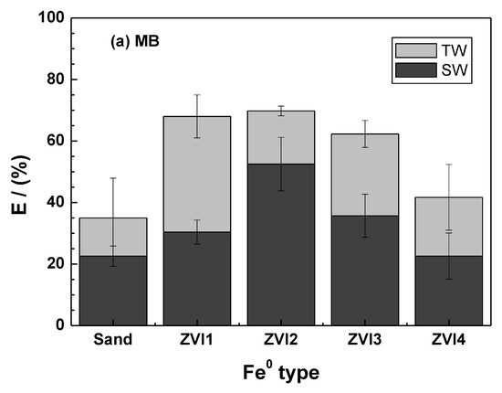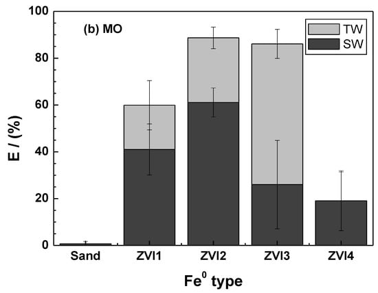 For MB (Figure 5a), the most significant TW vs. SW variability between replicates was observed for ZVI1 (error bars), while the lowest was recorded for ZVI4. Considering the absolute values, the following increasing order of efficiency is observed: ZVI4 > ZVI3 > ZVI2 > ZVI1. This ranking confirms the information from the kAA values (Table 2), showing that ZVI4 is significantly less reactive than the other three materials [9]. Another feature of Figure 5a is that ZVI4 performed only slightly better than sand alone in SW and TW. Based on the information in Figure 5a, ZVI1 can be recommended as the most reactive material, while ZVI2 and ZVI3 are very close in their efficiency for MB discoloration. The results of MO discoloration (Figure 5b) confirm the trend observed in Figure 5a, with the exception that ZVI1 has a significantly lower efficiency in both TW and SW. While this difference is difficult to justify, the overall results reaffirm the importance of characterizing the diversity among the Fe0 materials of environmental interest [85,86].