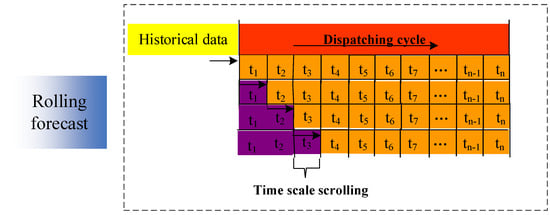 - For the rolling process with measured data, it is necessary to revise the previous forecasting process. The rolling correction principle of forecast in an operation period is shown in Figure 2. The yellow part represents the historical data, the purple part represents the measured data, the orange part represents the short-term forecast results, and the red part represents the whole operation cycle. Suppose that there is a measured value at a time , it needs to modify the forecasting at time , then the sample changes from the original to . At this time, the measured value is added to the sample, and the new sample is used for subsequent forecasting, so as to modify the forecasting in the process of rolling. In this way, the measured value can improve the accuracy of forecasting.