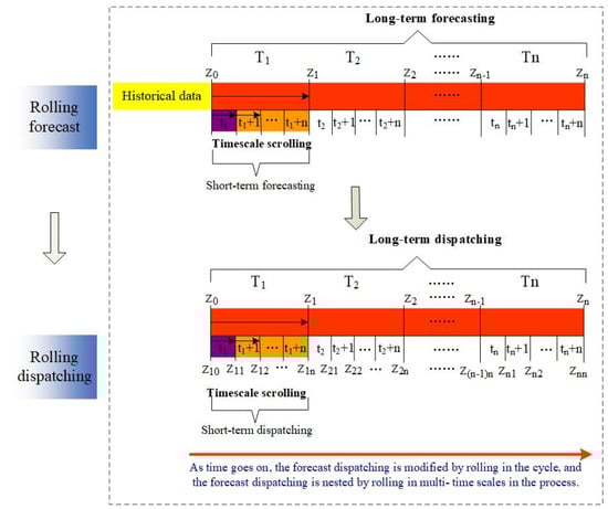 In this study, a mutual feedback mechanism between multi-time scales operation scheme and implementation operation scheme is established under the rolling correction mechanism to adapt to the change of conditions through process change. The working principle of the mutual feedback mechanism is shown in Figure 4. At the beginning of the operation cycle, the reservoir is operated according to the predetermined operation plan. The black arrows refer to the lengths of the time scales, and the dots refer to a long sequence of time. The yellow part represents historical data, the purple part represents measured data, the orange part represents short-term forecast results, and the red part represents the entire scheduling cycle.