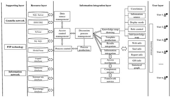 - Technical basis: The integrated platform is a platform developed based on the National 863 project in China. The platform is designed and constructed according to the requirements of the water conservancy industry standard of the People’s Republic of China “technical regulations for water conservancy information processing platform” (SL538-2011). The comprehensive integration platform can integrate Web information, XML information, report information, GIS information, statistical graphics, word documents, PPT and other information, and the user layer is mainly for users with login permissions to access the platform. The overall framework is shown in Figure 5.