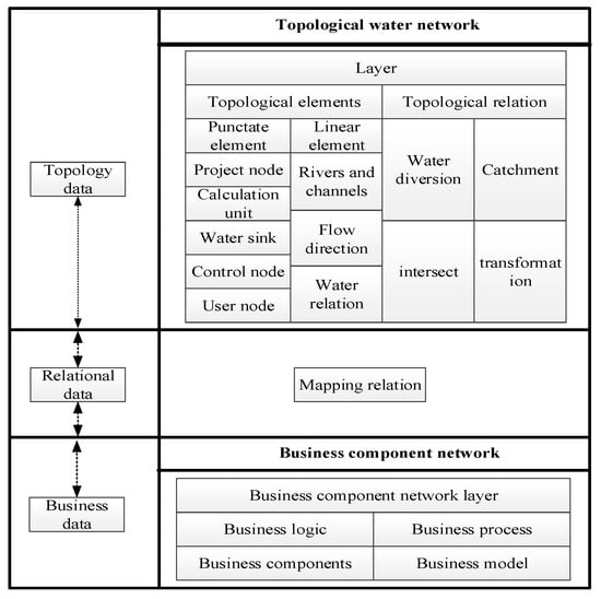 The topological water network is composed of many nodes, and each node has a logical relationship and data flow relationship. The business of each node is supported by the components of the business component layer. Through the mapping relationship between the two, the components are customized to the nodes, and through the combined application of business components, the related business of reservoir forecasting and operation is realized.